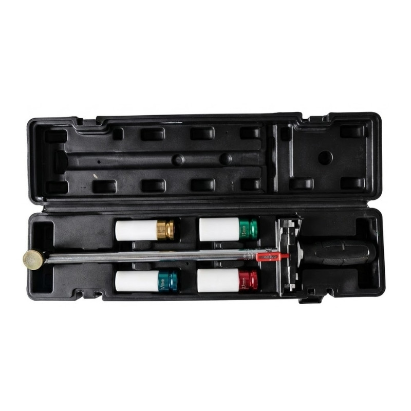 Klasický „gerenda“ typ momentového kľúča, ktorý poskytuje spoľahlivé a trvácne riešenie pre presné utiahnutie skrutiek. Na rozdiel od pružinových „klikacích“ kľúčov tu nie je vnútorný mechanizmus, ktorý by časom mohol ochabnúť alebo sa vychýliť, takže kľúč zostáva dlhodobo presný bez potreby kalibrácie. Sada obsahuje aj najdôležitejšie veľkosti kľúčov na matice kolies, takže je ihneď pripravená na výmenu kolies.