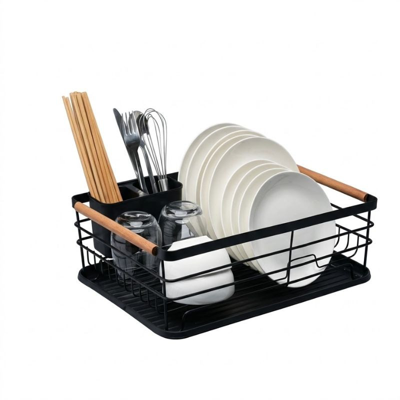 Jednopodlažný, čistý dizajn je ideálny na každodenné sušenie riadu. Jedna polovica mriežky je navrhnutá na stabilné vertikálne ukladanie tanierov, zatiaľ čo na vedľajšej rovnej ploche sa pohodlne zmestia poháre a menšie misky. Súčasťou sušiaka je aj čierny držiak na príbory s viacerými priehradkami, v ktorom môžete prehľadne sušiť lyžice, vidličky alebo dokonca drevené lyžice. Odkvapkávajúcu vodu zachytáva čierna miska na spodnej strane sušičky, vďaka čomu zostane vaša kuchynská linka vždy suchá a čistá.