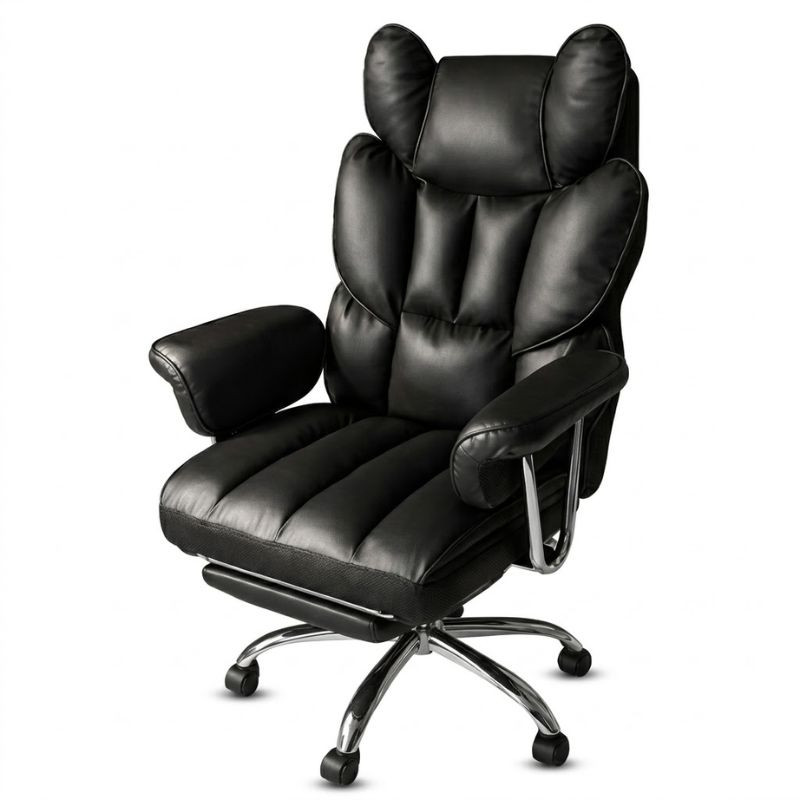 Otočná stolička RELAX PRO je kombináciou vynikajúceho komfortu a profesionálnej funkčnosti. Je vynikajúcou voľbou pre prácu v kancelárii alebo domáce použitie, pretože vďaka svojim ergonomickým riešeniam účinne podporuje telo počas dlhých pracovných dní. Vstavaná opierka na nohy a operadlo, ktoré sa dá sklopiť do uhla 155 stupňov a zaistiť, umožňujú úplné uvoľnenie počas prestávok. Čierny poťah z eko-kože zaisťuje elegantný a moderný vzhľad, zatiaľ čo sedák s dvojitou výplňou z penovej hmoty ponúka extra mäkkosť a odolnosť.