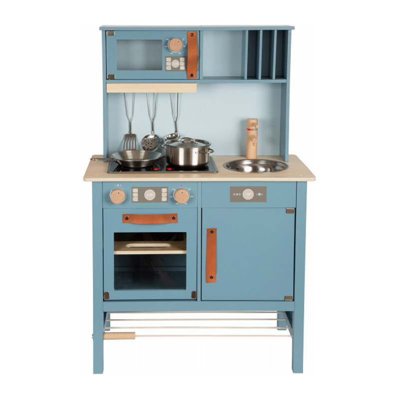 Dizajnový kúsok! Táto kuchyňa na hranie so svojou pevnou konštrukciou zaujme moderným farebným dizajnom v módnej dymovo modrej farbe av kombinácii s chladivými rukoväťami zo syntetickej kože v koňakovej farbe. Vzhľad dotvárajú prvky, ako je obojstranná zadná stena (vzhľad hladká/dlaždice) a povrchy potlačené kuchynskými detailmi v chladničke a rúre. Pracovná doska, otočné tlačidlá „click“, elektronická varná doska so svetlom/zvukom, kovový drez, úložný priestor na riad a rúra s vyberateľnou táckou/doskou zaisťujú realistickú hru.