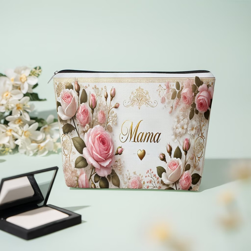 Táto štýlová kozmetická taštička na zips s kvetinovým vzorom je elegantným a praktickým doplnkom na každý deň. Dizajn zdobený romantickým ružovým vzorom a nápisom Mama z neho robí výnimočný darček pre mamičky, ale je ideálnou voľbou pre každého, kto má rád ženský, jemný vzhľad.