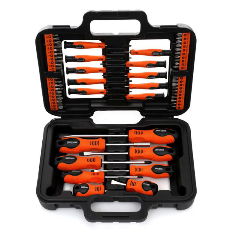 Sada obsahuje krížové a ploché skrutkovače a bity. Skrutkovače majú ergonomickú rukoväť s gumovým povrchom. 58-dielna sada je uložená v praktickom