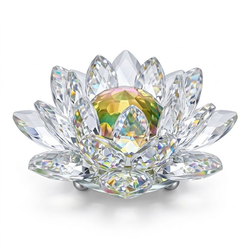 Táto elegantná a rafinovaná kryštálová dekorácia v tvare lotosového kvetu môže byť ozdobou každej miestnosti. Presne vybrúsené, priehľadné okvetné lístky krásne lámajú svetlo a dúhová (irizujúca) guľa v strede kvetu dodáva predmetu výnimočný, farebný lesk. Kvet lotosu je symbolom čistoty a harmónie, takže môže byť vynikajúcou voľbou do obývacej izby, spálne alebo dokonca do kancelárskeho prostredia, kde vyžaruje pokoj a estetický zážitok. Je to tiež perfektná voľba ako darček na špeciálne príležitosti.