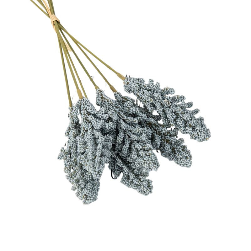 Textúra: Kvetinový trs je zložený z drobných guličiek z penovej hmoty, ktoré dodávajú vetvičkám hustý vzhľad a pripomínajú astilbu alebo poľné bobuľové vetvičky. Pružné stonky majú realistickú zelenú farbu.
