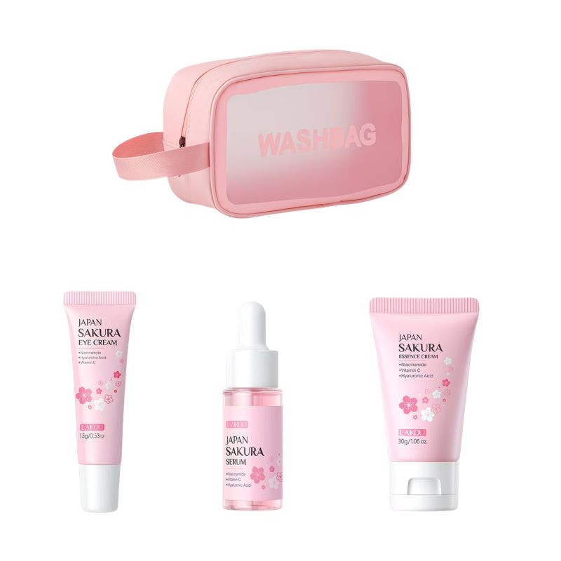 Táto štýlová sada LAIKOU v ružových odtieňoch rozmaznáva pleť silou japonských kvetov čerešne. Sada obsahuje tri kľúčové produkty na starostlivosť o pleť, ktoré vďaka kombinácii niacinamidu, vitamín C a kyselinu hyalurónovú, pomáhajú rozjasniť a hydratovať pleť a zachovať jej mladistvý lesk. Sadu dopĺňa elegantná, priehľadná ružová kozmetická taštička, ktorá zabezpečuje praktické uloženie doma aj na cestách.