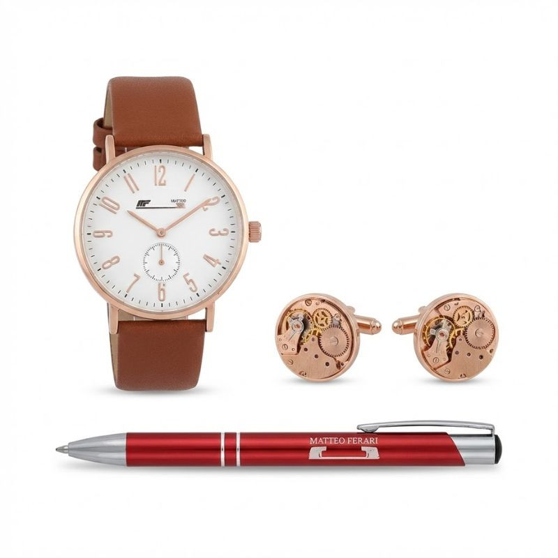 Matteo Ferari "Classic Rose" Pánska Darčeková Sada – Hodinky, Manžetové Gombíky a Pero (Béžová Darčeková Krabička) MF02B