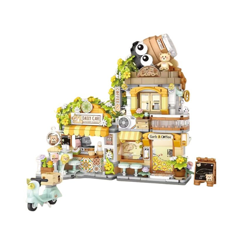Táto detailná mini stavebnica zobrazuje modernú dvojposchodovú kaviareň plnú šarmu a kreativity. Teplé odtiene žltej a hnedej, kvetinové dekorácie a veselá figúrka medvedíka vytvárajú okamžite útulnú atmosféru. Je to výborná voľba pre fanúšikov modelov, milovníkov kávy aj pre každého, kto chce pridať na poličku niečo hravé.