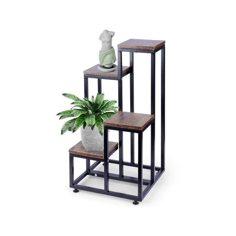 Tento štýlový a funkčný stojan na rastliny je ideálnym riešením na prezentáciu rastlín, dekorácií alebo iných ozdobných predmetov. Schodiskové usporiadanie ponúka elegantné a úsporné riešenie, pričom dodáva priestoru jedinečný vzhľad. Kombinácia kovu a dreva vytvára modernú, industriálnu atmosféru vo vašej domácnosti.