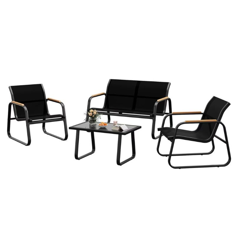 Vytvorte si dokonalé miesto na oddych vo vašej záhrade, na balkóne alebo terase s touto štýlovou a odolnou 4-dielnou sedacou súpravou. Súprava je ideálna na kávu, rozhovory alebo jednoducho na vychutnanie si čerstvého vzduchu. Minimalistický dizajn a čierna farba sa hodia do každého prostredia a dodávajú vášmu vonkajšiemu priestoru modernú eleganciu. Kombinácia pevnej oceľovej konštrukcie a priedušného materiálu Textilene zaručuje pohodlie, odolnosť a jednoduchú údržbu aj pri intenzívnom používaní.