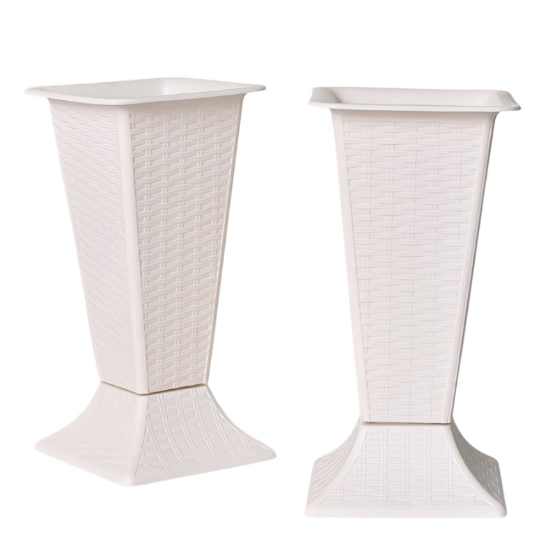 Tento elegantný biely kvetináč spája rustikálny a moderný štýl, vďaka čomu môže byť ozdobou každého domova, balkóna alebo záhrady. Povrch kvetináča zdobí jemná textúra s pleteným efektom, ktorá mu dodáva jedinečný vzhľad. Rozšírená základňa nie je len estetickým prvkom, ale poskytuje rastlinám aj stabilnú oporu. Napriek ľahkému materiálu je odolný, takže je ideálnou voľbou ako pre interiérovú dekoráciu, tak aj pre záhradníčenie vonku.