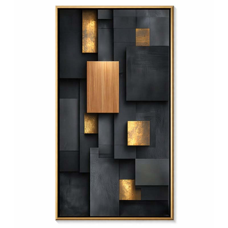 Elegantná a moderná dekorácia na stenu, ktorá dodá vášmu domovu alebo kancelárii jedinečný štýl. Geometrický blokový vzor je vytvorený kombináciou čiernych, tmavosivých a zlatých prvkov, ktoré obrazu dodávajú luxusný dojem a hĺbku. Moderný dizajn sa perfektne hodí do interiérov v minimalistickom, modernom alebo industriálnom štýle.