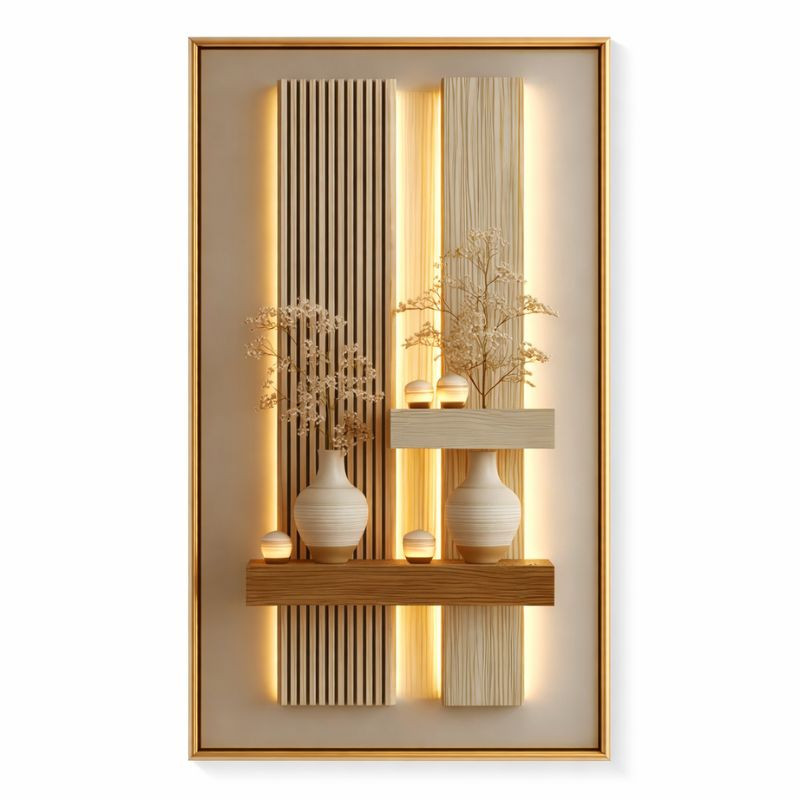 Elegantná a moderná nástenná dekorácia, ktorá vo vašej domácnosti vytvorí jedinečnú atmosféru. Kompozícia znázorňuje prvky s dreveným efektom, dekoratívne police, vázy a rastlinné motívy, ktoré zaisťujú harmonický a prírodný vzhľad. Jemný svetelný efekt dodáva obrazu modernú a teplú atmosféru.