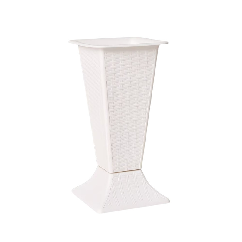 Tento elegantný biely kvetináč spája rustikálny a moderný štýl, vďaka čomu môže byť ozdobou každého domova, balkóna alebo záhrady. Povrch kvetináča zdobí jemná textúra s pleteným efektom, ktorá mu dodáva jedinečný vzhľad. Rozšírená základňa nie je len estetickým prvkom, ale poskytuje rastlinám aj stabilnú oporu. Napriek ľahkému materiálu je odolný, takže je ideálnou voľbou pre interiérovú dekoráciu aj záhradníctvo vonku.