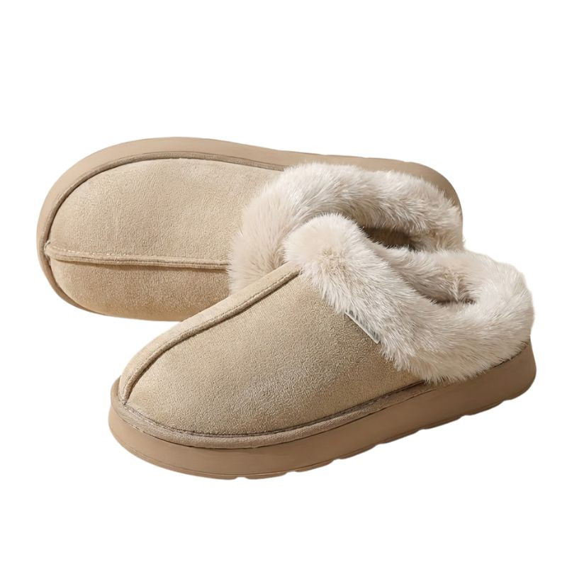 Módne dámske papuče s plyšovou podšívkou, béžové – hrubá EVA podrážka XV3628746