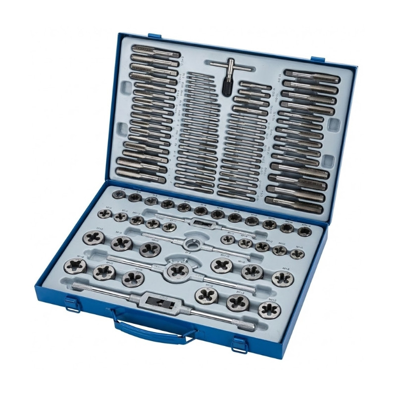 Profesionálna 110-dielna sada závitníkov a závitových fréz s metrickým rozmerovaním, ideálna na tvorbu a opravu vnútorných a vonkajších závitov. Náradie z legovanej ocele poskytuje vysokú odolnosť proti opotrebovaniu a dlhú životnosť, čo robí túto sadu ideálnou pre dielne aj náročné domáce použitie.