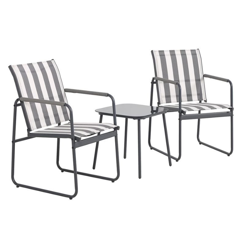 Ľahká, ale odolná oceľová konštrukcia zaisťuje stabilitu a zároveň umožňuje jednoduché premiestňovanie. Sedacie plochy z priedušnej tkaniny poskytujú pohodlie aj v teplejších dňoch, takže sa dajú pohodlne používať aj dlhší čas.