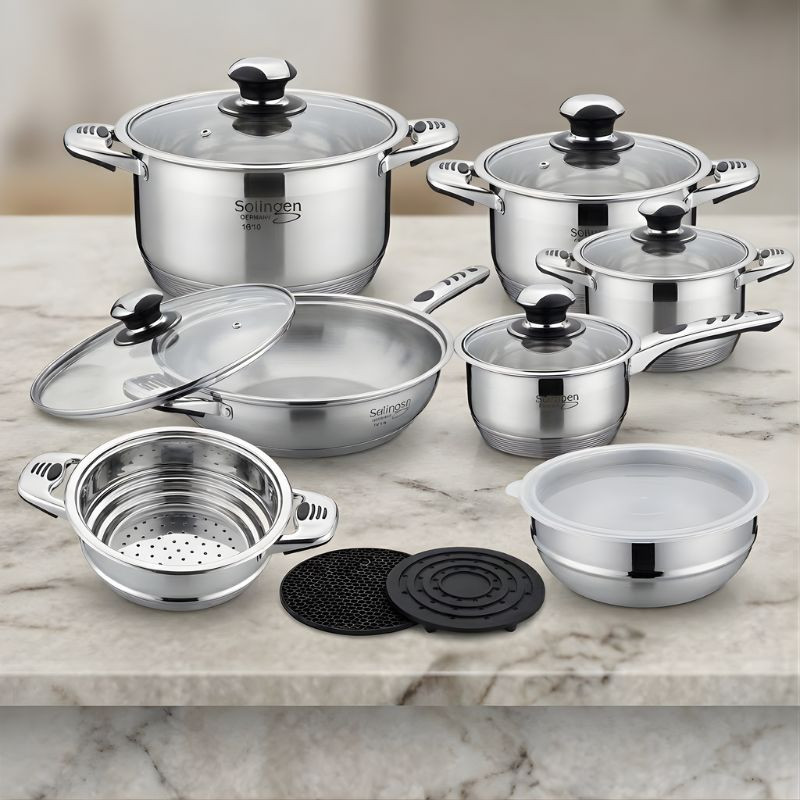 16-dielna sada riadu Solingen Germany je vynikajúcou voľbou pre každodenné varenie. Nádoby vyrobené z prvotriednej nehrdzavejúcej ocele 18/10 sú odolné, odolné voči korózii a dlhodobo si zachovávajú lesklý vzhľad. Hrnce a panvice rôznych veľkostí umožňujú pohodlné prípravu polievok, cestovín, mäsitých jedál alebo zeleniny.