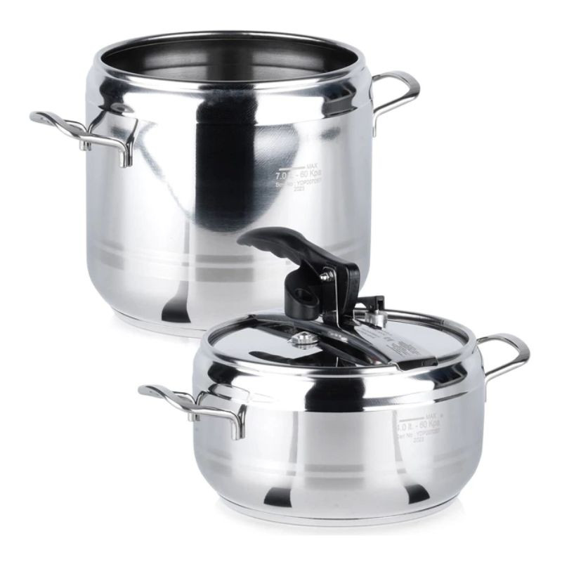 Táto sada tlakových hrncov PROFI je ukážkou praktickosti a úspory miesta. Balenie obsahuje dva hrnce s objemom 4 a 7 litrov a jednu spoločnú tlakovo odolnú pokrievku, ktorá presne pasuje na oba hrnce. Vďaka tomu si vždy vyberiete správnu veľkosť podľa množstva jedla. Menší 4 litrový hrniec je vhodný na rýchle večere, dusenú zeleninu alebo prílohy, zatiaľ čo 7 litrový hrniec je ideálny na vývary, huspeninu alebo guláše pre väčšiu spoločnosť.