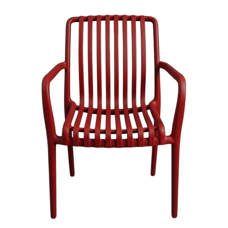 Plastová záhradná stolička Paris je ideálnou voľbou pre pohodlný oddych vonku. Vďaka svojej čistému dizajnu a odolnej konštrukcii v červenej farbe si táto stolička dlhodobo udrží svoje miesto na terase, balkóne alebo v záhrade. Vertikálne rebrované operadlo a sedák zaisťujú moderný vzhľad a vynikajúce vetranie počas horúcich letných dní. Integrované podrúčky zvyšujú pocit pohodlia, zatiaľ čo praktická stohovateľná konštrukcia uľahčuje úsporné skladovanie, ak máte viac kusov.