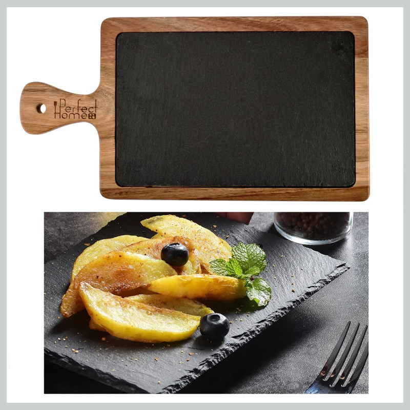 Akáciová a kamenná doska na servírovanie, ktorá môže byť použitá ako doska na steak, ovocná misa, miska na predjedlá, dezertná miska, syrová doska alebo miska na šalát a pod.