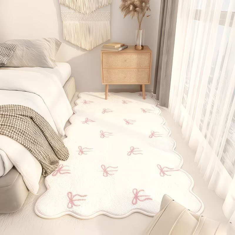 Dizajn: Biely koberec s vlnitými okrajmi, zdobený pastelovo ružovými mašľami. Jeho vzhľad pripomína štýl „coquette“ alebo „shabby chic“.