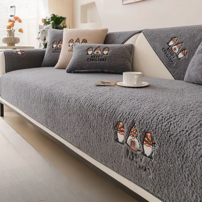 Vianočný plyšový, nešmykľavý poťah na pohovku s motívom Santa Clausa. Vyrobený z hustej, mäkké fleecovej tkaniny, vhodný pre domáce zvieratá a odolný proti opotrebeniu. Poťah je zdobený vyšívanými vianočnými motívmi, je prateľný, ľahko sa nasadzuje a má nešmykľavý povrch. Ideálny do obývacej izby, kancelárie alebo hosťovskej izby.