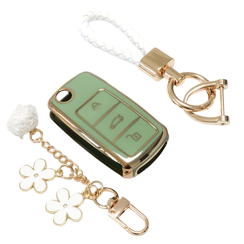Táto sada ochranných puzdier v pastelovo mätovo zelenej farbe dodá vašim kľúčom od auta svieži a mladistvý vzhľad. Zlaté detaily a jemnosť mätovej farby vytvárajú sofistikovanú estetiku. Puzdro tesne obopína diaľkový ovládač, čím ho chráni pred škrabancami, zatiaľ čo biely pletený remienok a kvetinové doplnky dodávajú sade hravý štýl.