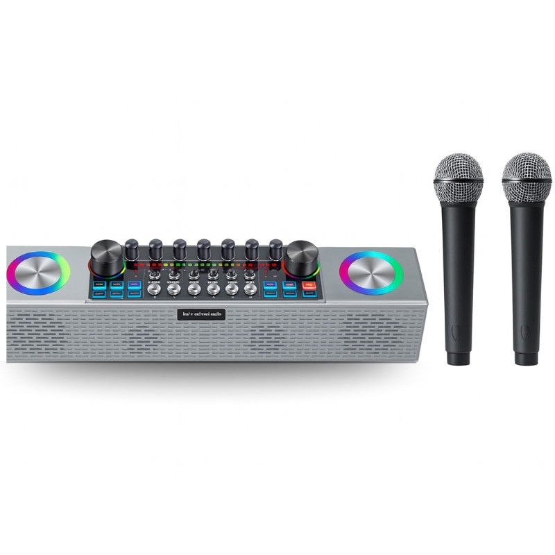 LIVE SOUND CARD audio integrated set je kompletná profesionálna súprava na nahrávanie a mixovanie zvuku, ideálna pre živé vysielania, podcasty, spev alebo štúdiovú prácu. Vďaka vstavaným ovládacím prvkom, efektom a mikrofónovým vstupom môžeš jednoducho nastaviť kvalitu zvuku a pridať hudobné efekty podľa potreby.