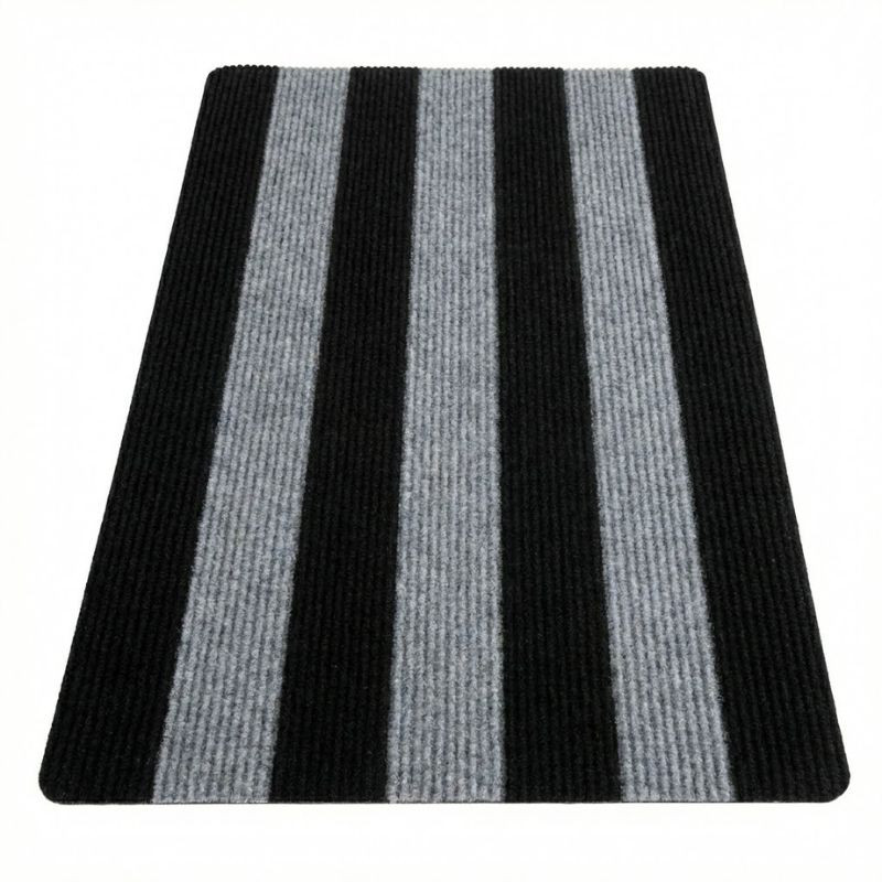 Táto praktická a moderná vstupná rohož je vynikajúcou voľbou na udržanie čistoty vo vašej domácnosti alebo kancelárii. Dizajn so svetlosivými a čiernymi pruhmi, ktorý je v centre pozornosti na obrázku, zaisťuje čistý vzhľad a ľahko sa hodí do väčšiny vstupných priestorov.