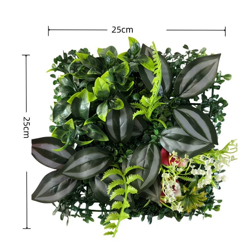 Kompaktný, ale pôsobivý zelený nástenný panel, ktorý vytvára prirodzený dojem v akejkoľvek miestnosti alebo vonkajšom priestore. Panel s rozmermi 25 × 25 cm je vyrobený z kombinácie rôznych listových a kvetinových prvkov, čím zaisťuje pestrý a realistický celkový dojem.