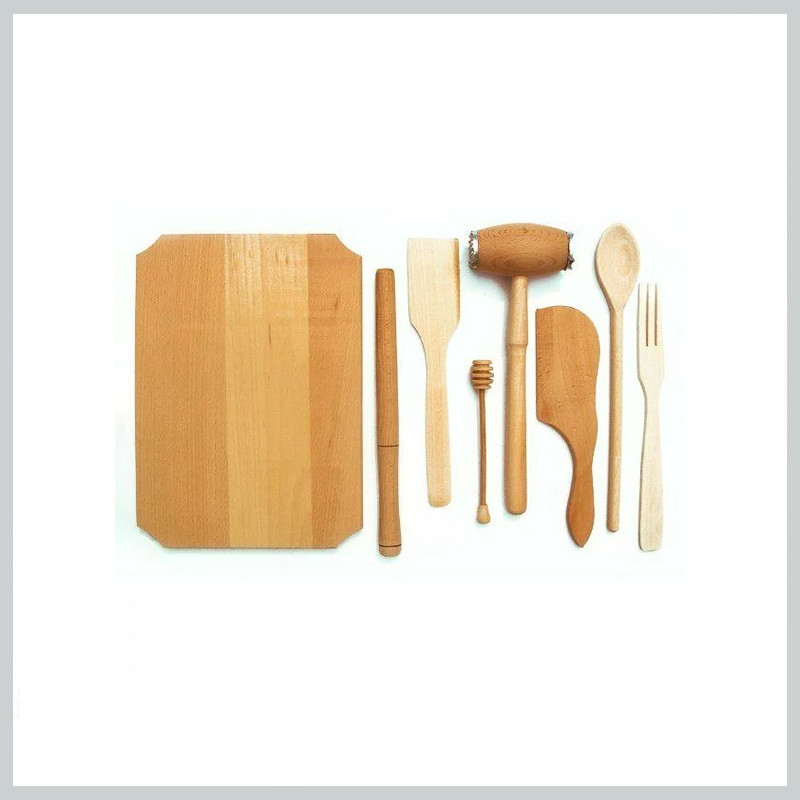 Obsah: rezacie dosky, kladivo na mäso, nôž, vidlička, medová lyžica, drevená lyžica, špachtľa, mažiare a hmoždíř
