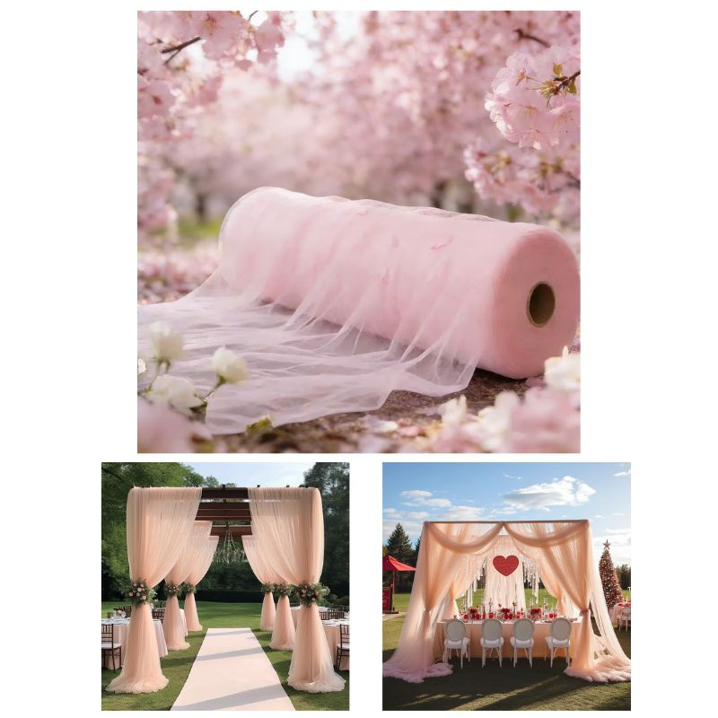 Láhodne splývajúca, elegantná tyla, ktorá je ideálnou voľbou na výzdobu výnimočných príležitostí. Jemný, svetloružový odtieň vytvára romantickú atmosféru, vďaka čomu je ideálny na svadby, zásnuby alebo slávnostné udalosti.