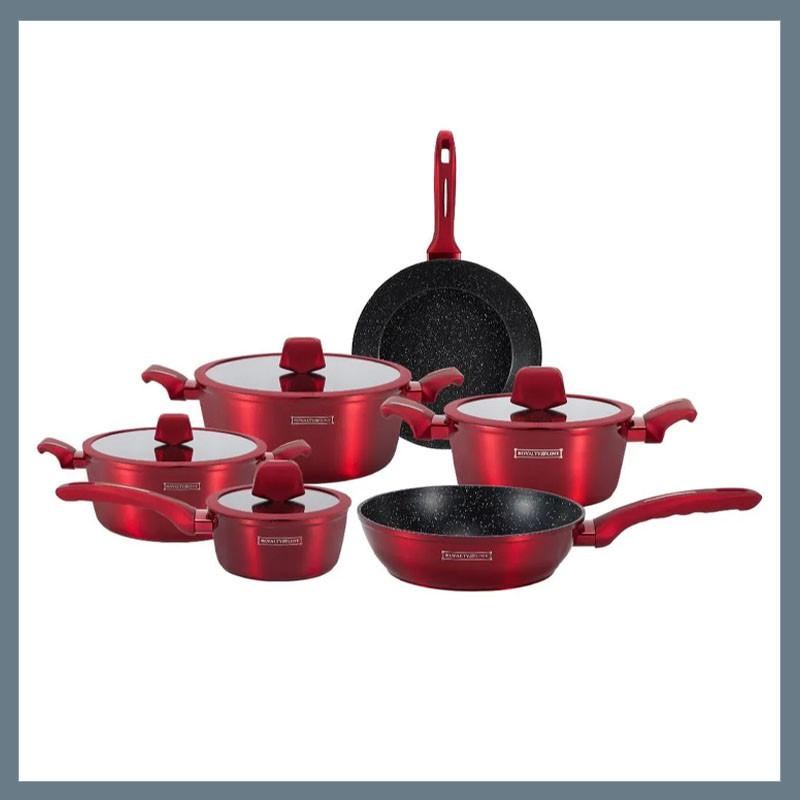 Súprava riadu Royalty Line T10Red s 10 dielmi je vďaka svojmu modernému vzhľadu a vysokokvalitným materiálom ideálnou voľbou do každej kuchyne. Mramorový povrch zaisťuje nepriľnavé varenie, zatiaľ čo silikónové rukoväte zaručujú pohodlné a bezpečné používanie. Sada riadu sa dá používať aj na indukčných varných doskách, vďaka čomu je univerzálne použiteľná.
