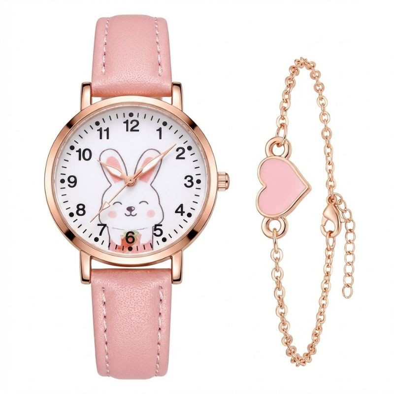 Roztomilá súprava dámskych hodiniek a náramkov s motívom zajačika – pastelovo ružová QQ11707971