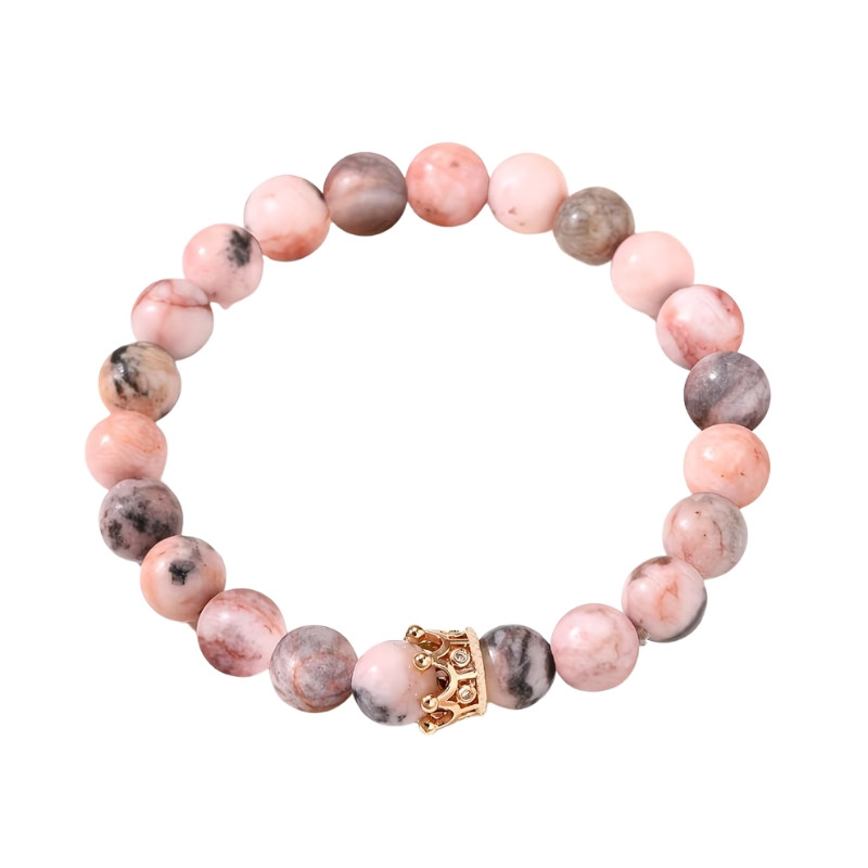 Tento elegantný náramok z ružových kamienkov je výnimočným darčekom pre každú mamičku. Jemne vyleštené perličky s harmonickým farebným prechodom zaisťujú ženský a rafinovaný vzhľad, zatiaľ čo zlatá korunka umiestnená uprostred je symbolom lásky a úcty.
