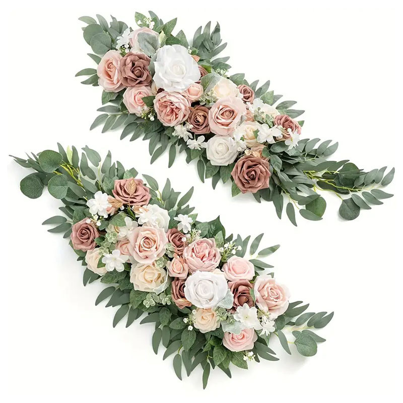 Elegantná a nadčasová kvetinová kompozícia, ktorá ponúka štýlové riešenie pre rôzne príležitosti aj priestory. Realistická kombinácia ruží a zelených listov pôsobí vkusne a sofistikovane, pričom dekorácia je trvácna a bezúdržbová. Ideálna na svadobné brány, slávnostné stoly, dekoráciu do domácnosti alebo sezónnu výzdobu.