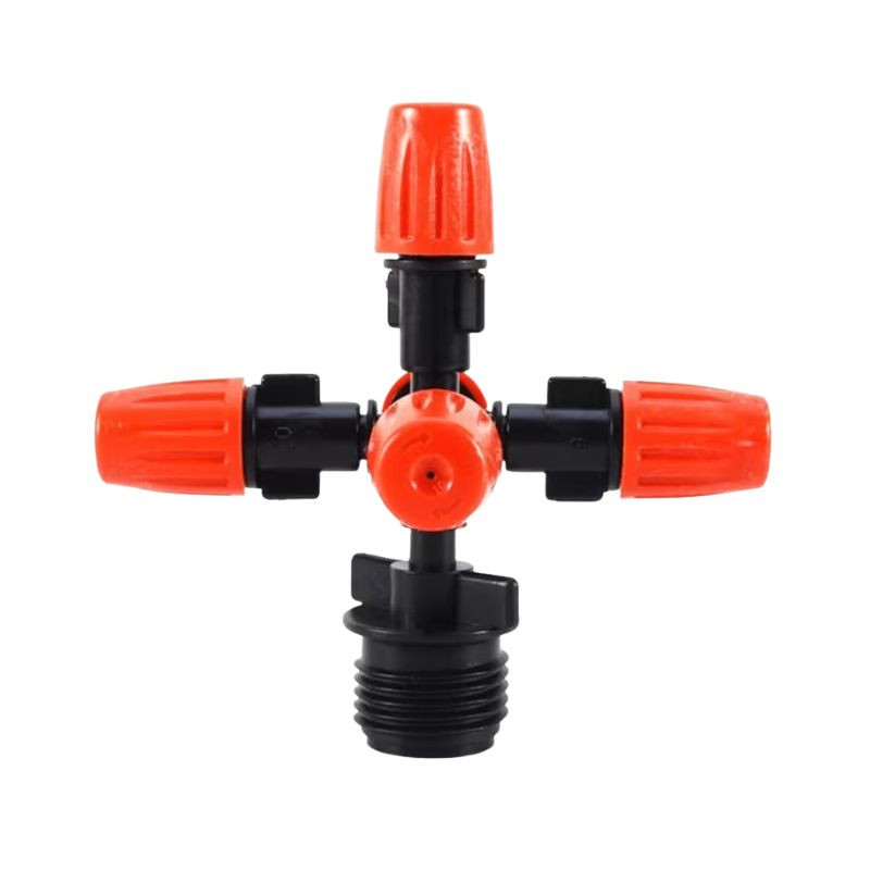 Päť tryskových hláv v tvare kríža: Umožňuje rovnomerné a širšie zvlhčovanie v záhradných skleníkoch alebo na terasách.