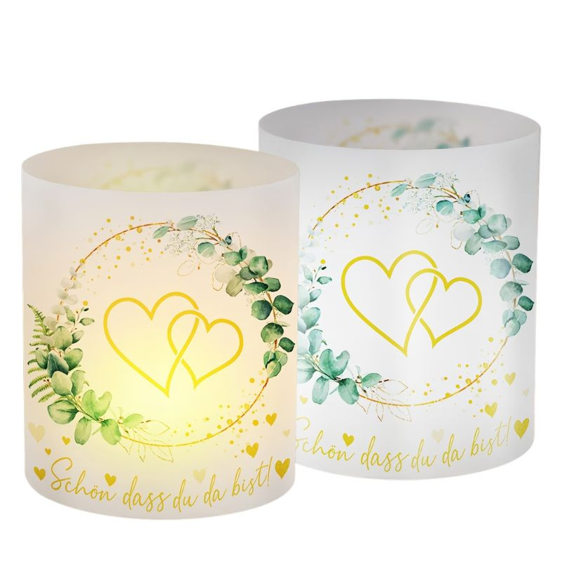 Očarte sviatočný stôl touto rafinovanou sadou lampášov. Dekorácia z hodvábne lesklého, priehľadného materiálu vyžaruje mäkké a útulné svetlo, ak do nej vložíte čajovú sviečku. Elegantný eukalyptový veniec na tienidlách, prepletené srdcia v zlatej farbe a nápis v nemčine „Schön dass du da bist!“ (Som rád, že si tu!) je milým a prívetivým odkazom pre všetkých hostí. Vynikajúca voľba na svadby, zásnubné večere alebo výročia, kde je cieľom vytvoriť romantickú a prírodnú atmosféru.