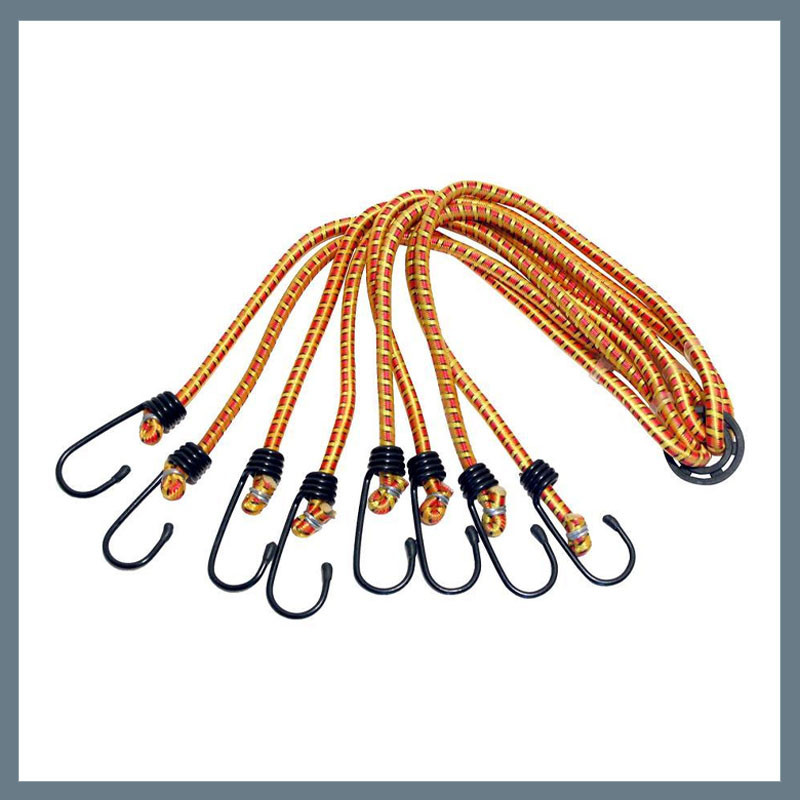 Flexibilné gumové popruhy s kovovými háčikmi v prémiovej kvalite. Vďaka jedinečnému dizajnu sú štyri samostatné 80 cm dlhé upevňovacie popruhy spojené s centrálnym krúžkom, čím poskytujú celkom osem upevňovacích bodov.