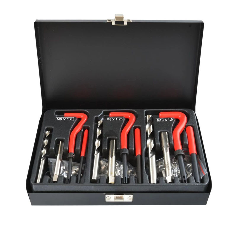 Vrták M6x1,0, vrták M8x1,25, vrták M10x1,5, opravná závitová vložka M6x1,0x10,8 mm, opravná závitová vložka M8x1,25x10,8 mm, opravná závitová vložka M10x1,5x13,5 mm, vtláčací nástroj M6x1,0, vtláčací nástroj M8x1,25, M10x1,5 vtláčací skrutkovač, 25 ks M6x1,0x10,8 mm závit, 25 ks M8x1,25x10,8 mm závit, 25 ks M10x1,5x13,5 mm závit