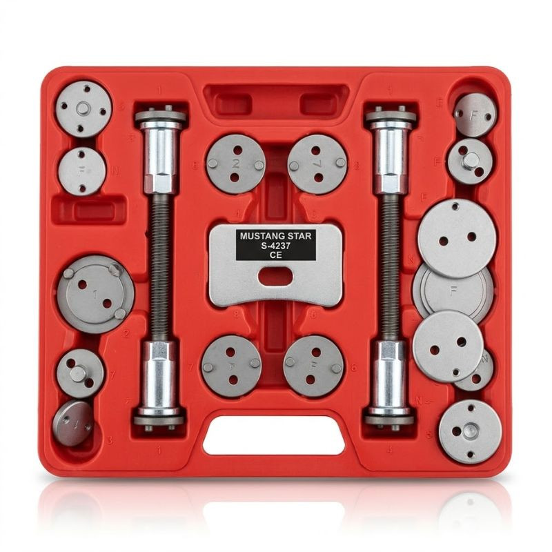 Táto profesionálna sada na stlačenie brzdového valca Mustang Star je nevyhnutným náradím pre každú autoservisnú dielňu a dobre vybavenú domácu garáž.