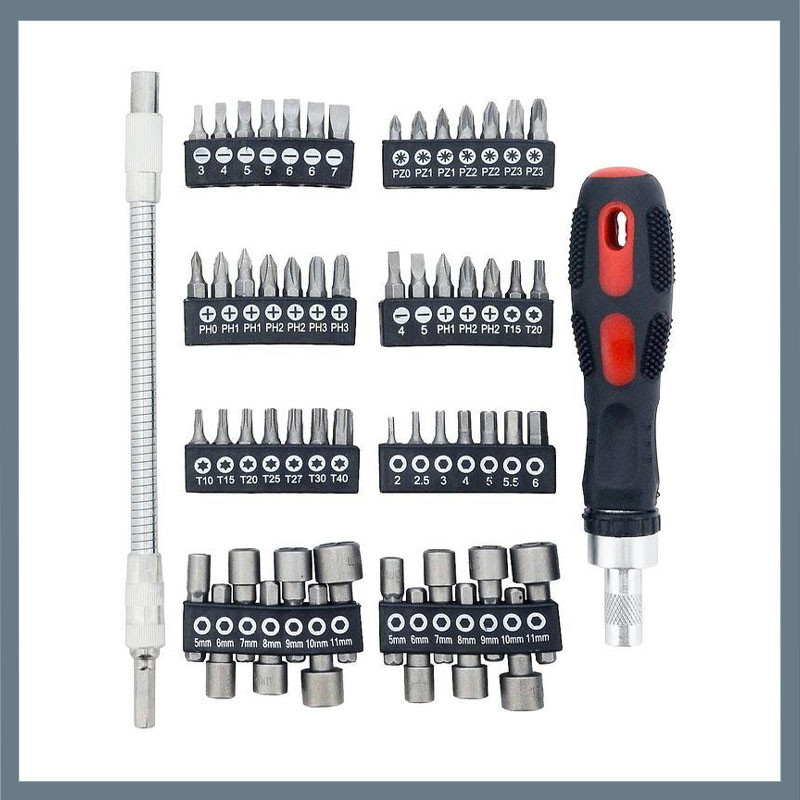 Praktická sada račňových skrutkovačov vybavená flexibilným predĺžením a rôznymi bitmi. Balenie obsahuje niekoľko najčastejšie používaných bitov.