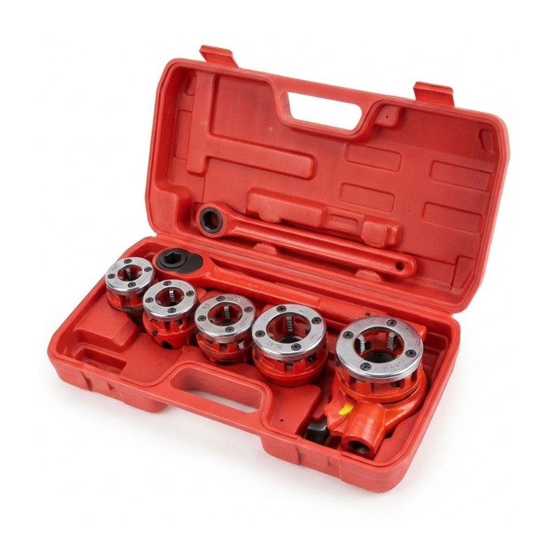 Vysoko kvalitná, prenosná sada ručných rezačiek na rúry, ideálna pre inštalačné práce s vodou, plynom a kúrením. Mechanizmus s račňou umožňuje presné a ľahké rezanie závitov na pozinkovaných a železných rúrach, aj v stiesnených priestoroch alebo v blízkosti stien. Sada obsahuje najčastejšie používané imperiálne veľkosti až do priemeru 1 1/4".