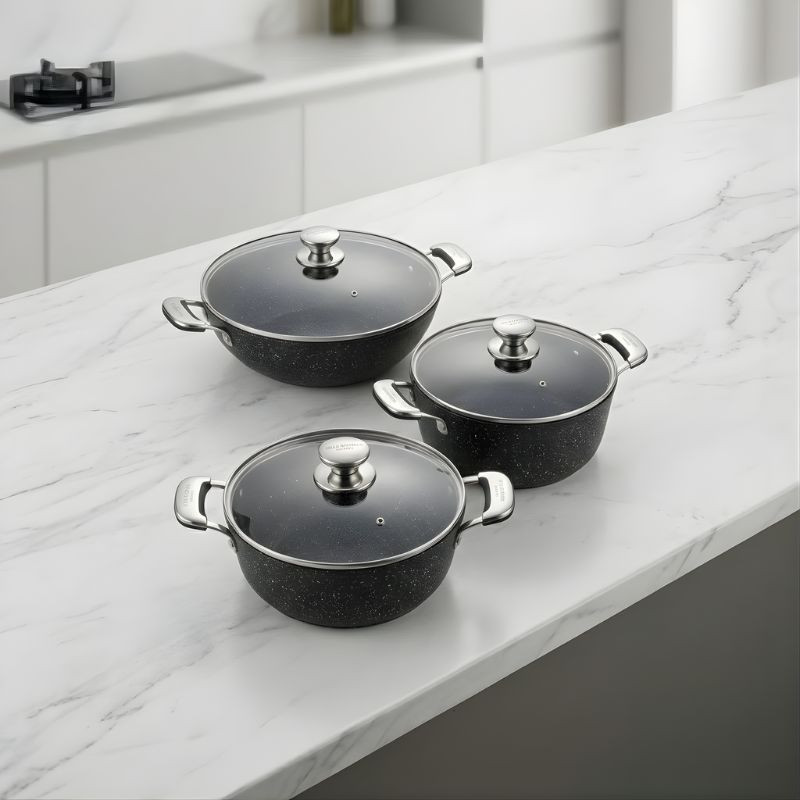 Sada obsahuje tri nádoby rôznych veľkostí, takže je vhodná na prípravu viacerých druhov jedál naraz. Hrubostenná konštrukcia pomáha udržať teplo, zatiaľ čo nepriľnavý povrch uľahčuje varenie a čistenie.
