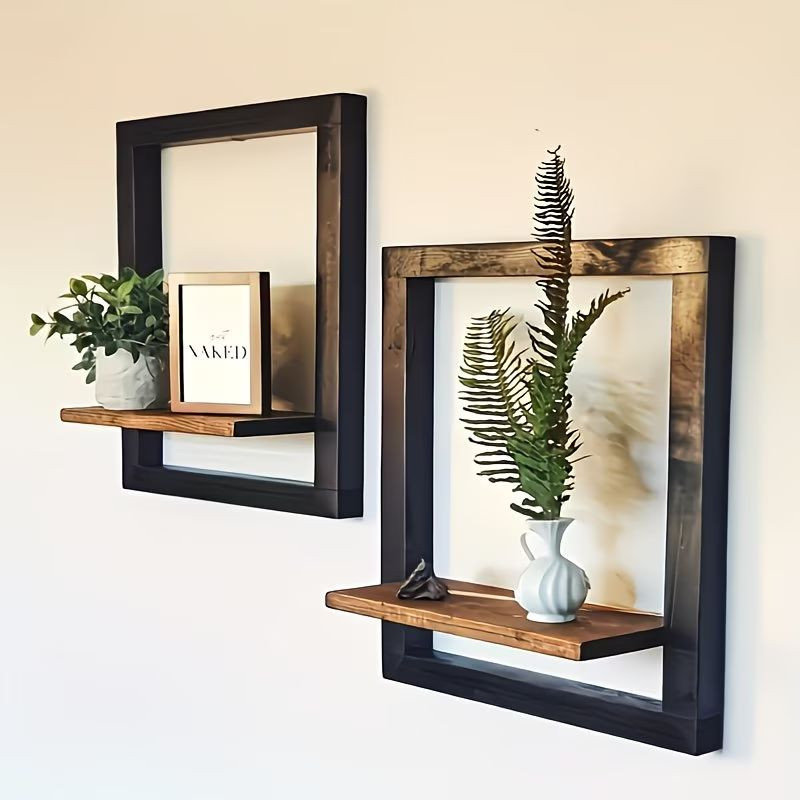 Sada obsahuje dve vystavovacie police s obdĺžnikovým rámom v dvoch rôznych veľkostiach, ktoré sa dajú využiť na dekoratívne aj praktické účely. Sú vhodné na umiestnenie fotografií, sviečok, menších kníh, albumov, dekoratívnych predmetov alebo kvetín v črepníkoch.
