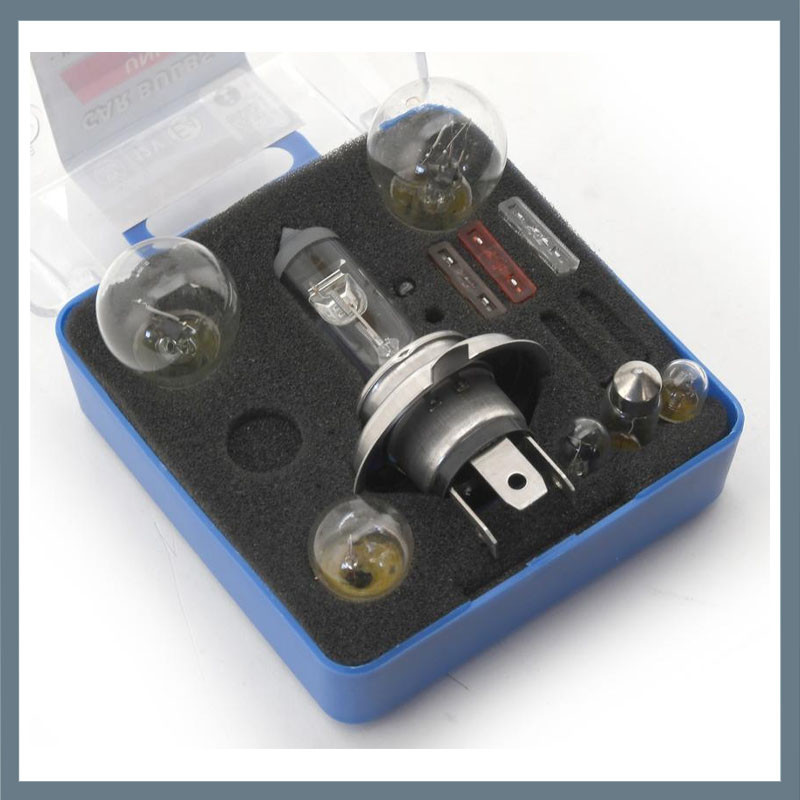 Sada náhradných žiaroviek a poistiek s certifikátom E pre osobné automobily, v priehľadnej kompaktnej plastovej krabičke. Praktické riešenie na cesty, do núdzových situácií alebo ako súčasť povinného príslušenstva vozidla.