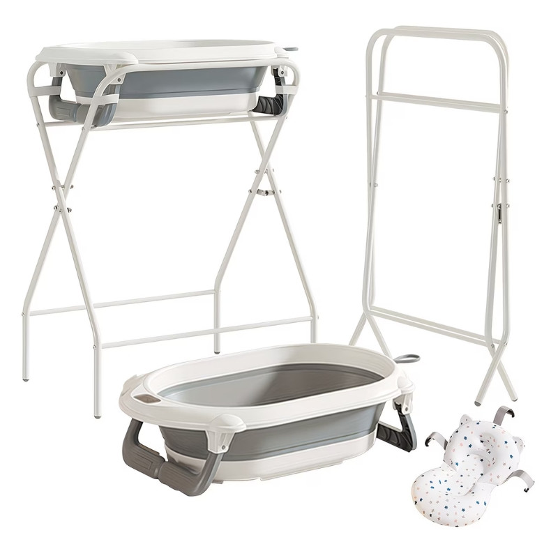 Praktická a priestorovo úsporná sada detskej vaničky, ktorá obsahuje stabilný kovový stojan, integrované kúpeľné sedadlo a funkciu vypúšťania vody. Ideálne riešenie pre pohodlné a bezpečné kúpanie novorodencov a dojčiat doma.
