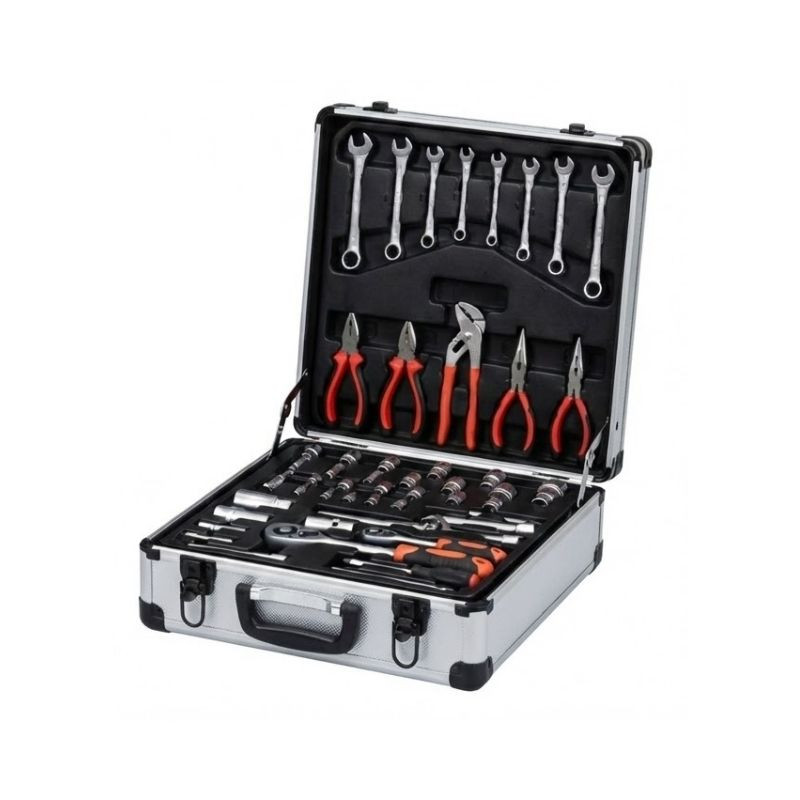 Najväčšou výhodou sady je trolley systém: náradie je uložené v pevnom, uzamykateľnom hliníkovom kufri s kolieskami a vysúvateľnou teleskopickou rukoväťou. Nemusíš ťažký kufor nosiť – jednoducho ho ťaháš za sebou ako cestovný kufor.