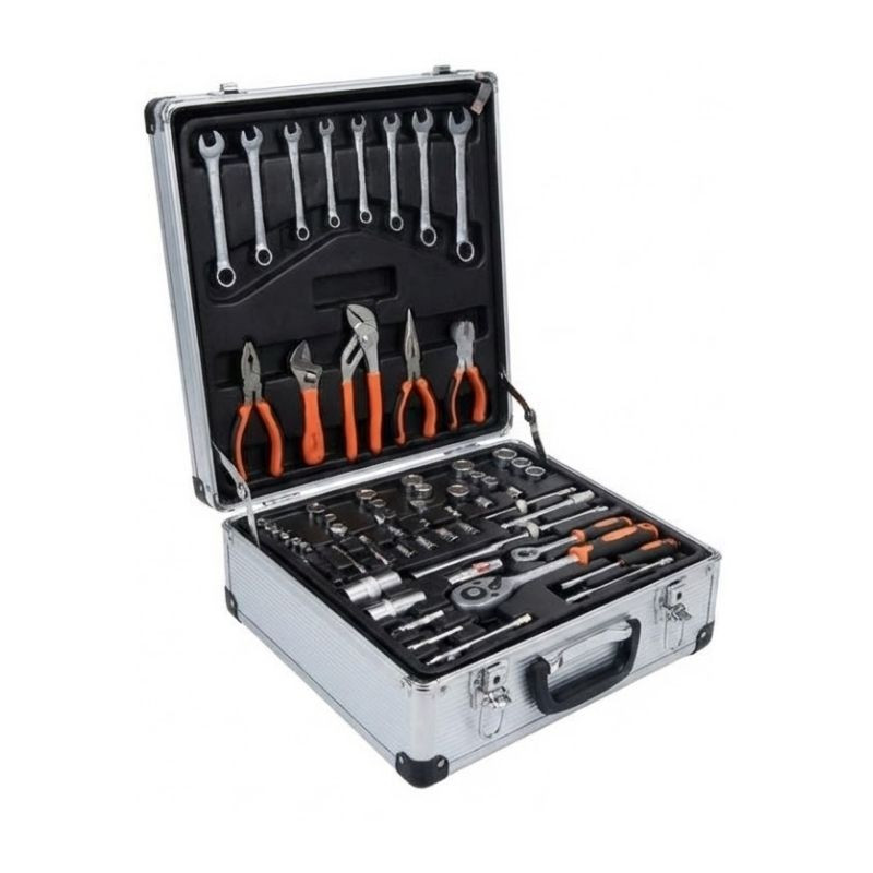 Kompletné vybavenie: Podľa obrázkov sada obsahuje rôzne kliešte (vodovodné, kombinované, bočné), nástrčné kľúče s račňami, predlžovacie nadstavce, pracovné rukavice a viazačky.