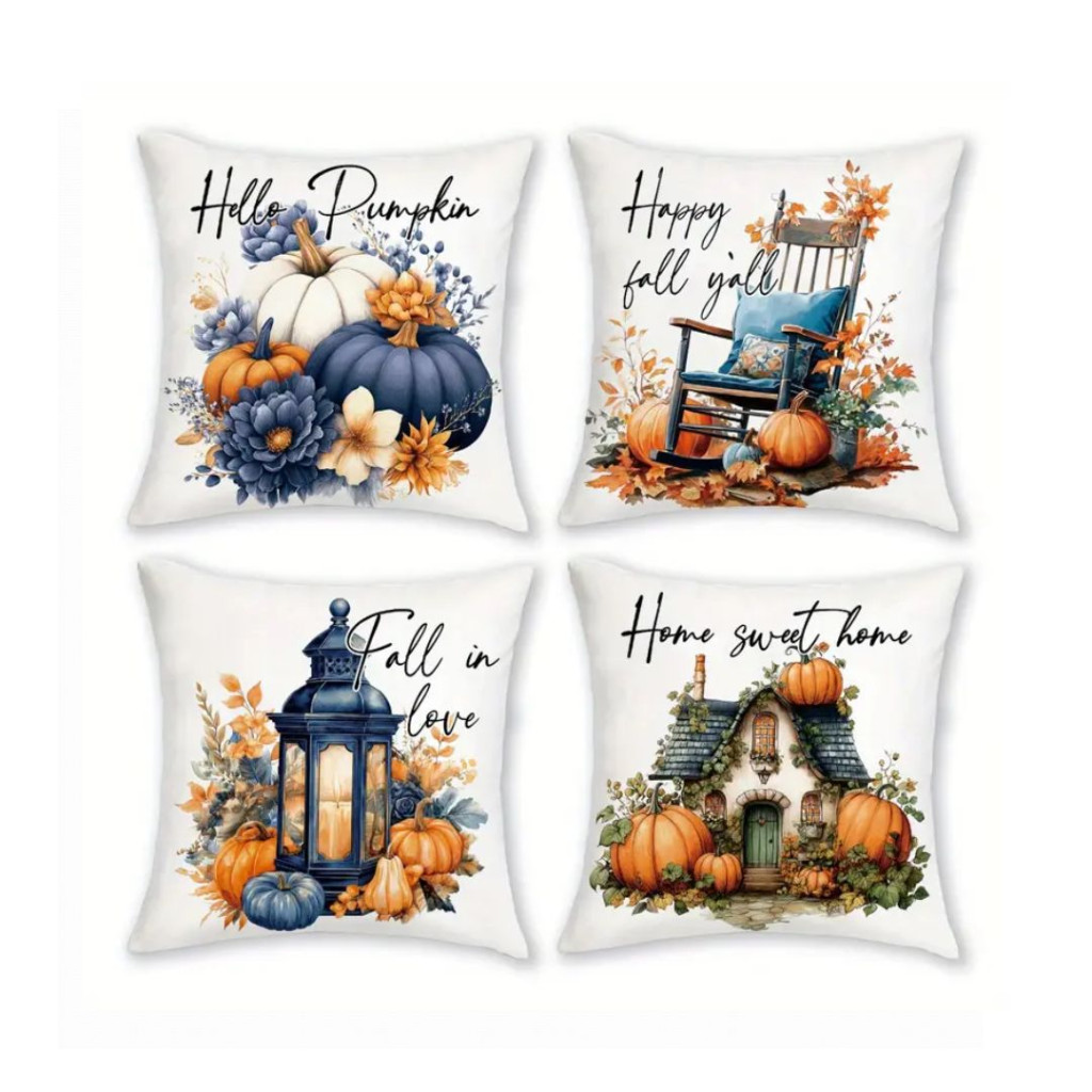 Táto 4 dielna súprava prémiových dekoratívnych obliečok na vankúše s krásnymi jesennými vzormi vnesie do vášho domova teplú a útulnú atmosféru. Sezónne motívy, tekvice, kvety, lampáš, hojdacie kreslo a rozprávkový domček sú skvelým doplnkom do obývačky, spálne aj na terasu.